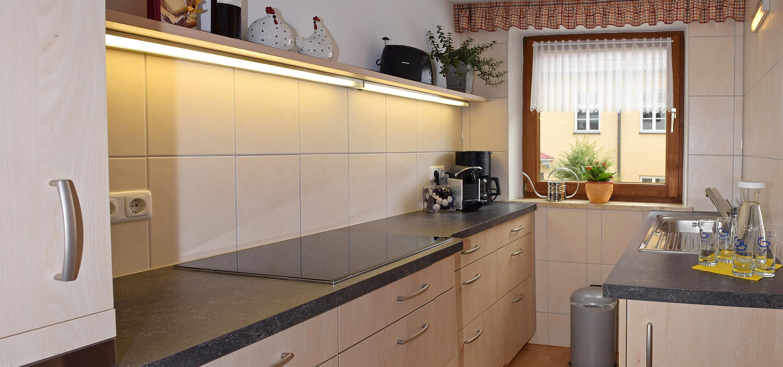 Die moderne Küche ist vollständig ausgestattet und lässt keine Wünsche offen. Ceran-Kochfeld, Backofen, Geschirrspüler, Kühlschrank mit Gefrierfach sowie Nespresso- und Kaffeemaschine stehen Ihnen zur Verfügung. Mikrowelle, Eierkocher, Wasserkocher und Toaster runden das Angebot ab. Frisches Granderwasser steht Ihnen kostenlos bereit.