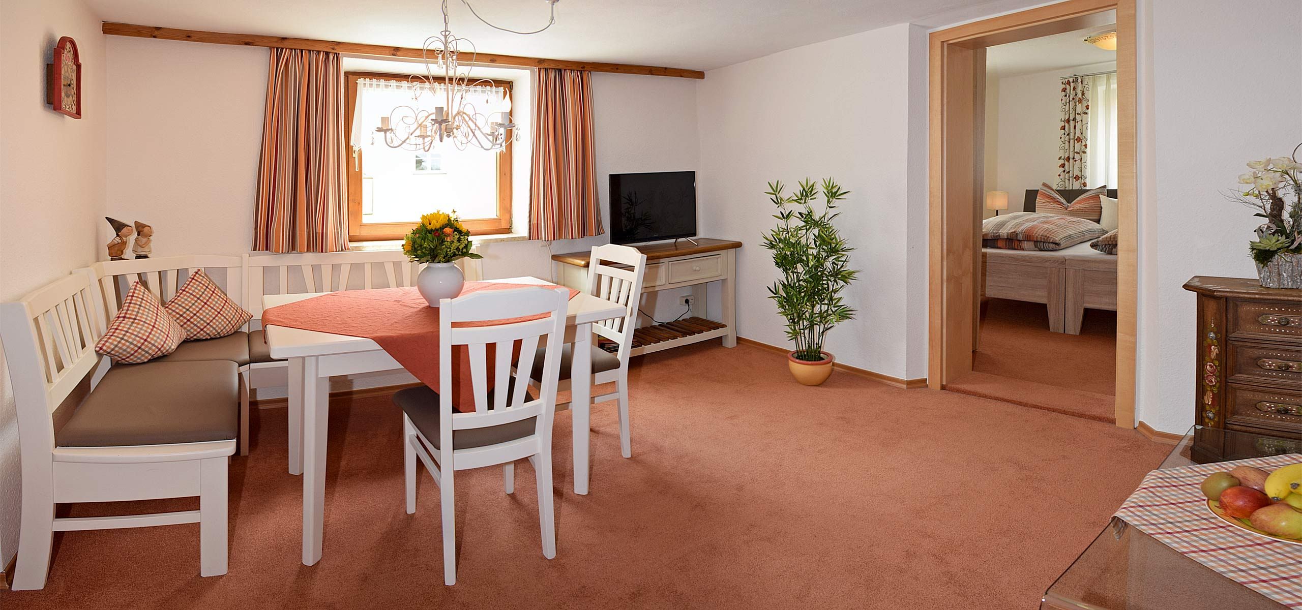 Das helle und gemütliche Wohnzimmer lädt zum Ankommen und Wohlfühlen ein. Eine bequeme Kuschel-Couch und der einladende Essplatz mit Eckbank bieten viel Platz für gemeinsame Mahlzeiten, Spiele oder ruhige Abende. Ein Flachbildschirm mit SAT-TV und ein stilvoller Lesesessel mit Stehlampe sorgen für zusätzlichen Komfort und gemütliche Stunden.